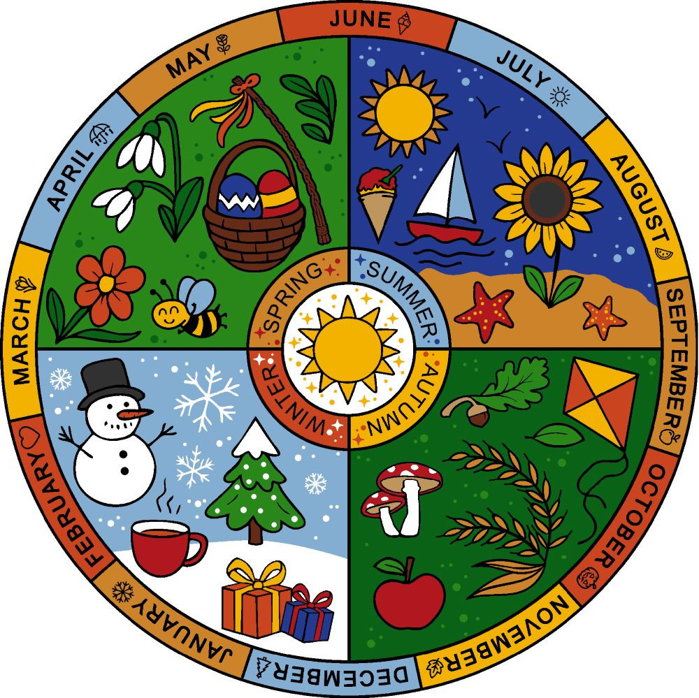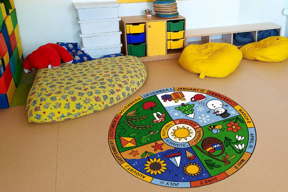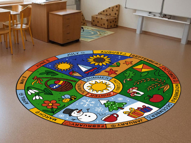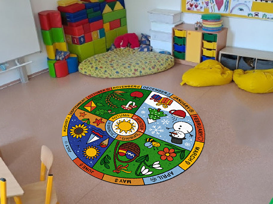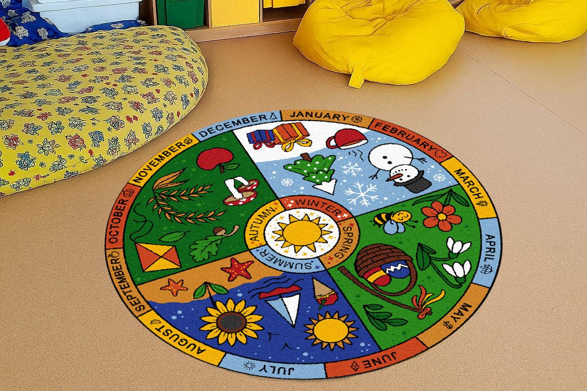 Standardní rozměry: kruh průměr 200 cm | Didaktický koberec ROČNÍ OBDOBÍ (anglicky) | Podkladová vrstva: guma 1,2 | Pratelný materiál do 30°C