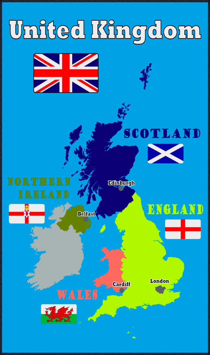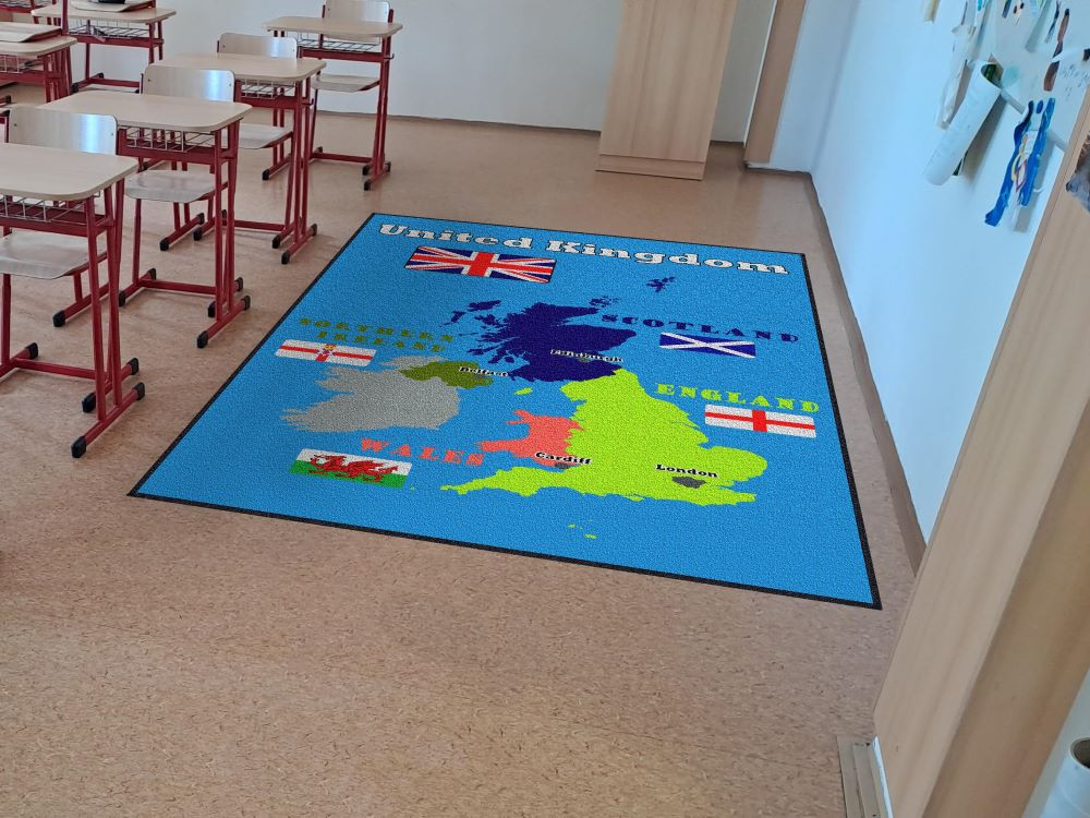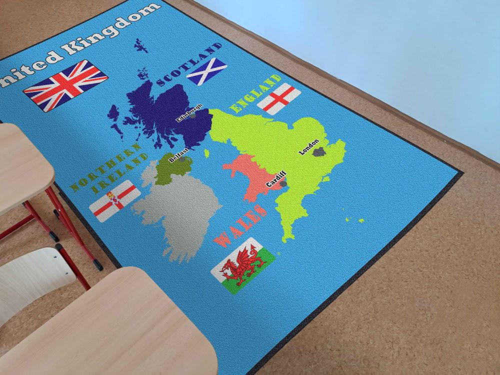 Standardní rozměry: 195 x 330 cm | Didaktický koberec ZEMĚ SPOJENÉHO KRÁLOVSTVÍ (anglicky) | Velmi odolný materiál na vysokou zátěž - Polyamid Etoncolor | Pratelný | Protiskluzový podklad | Bezpečnostní obvodové lemování proti zakopnutí | Naše zakázková výroba - výroba a dodání 14 dnů