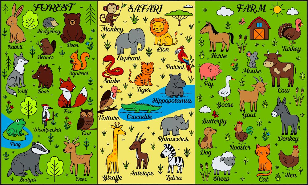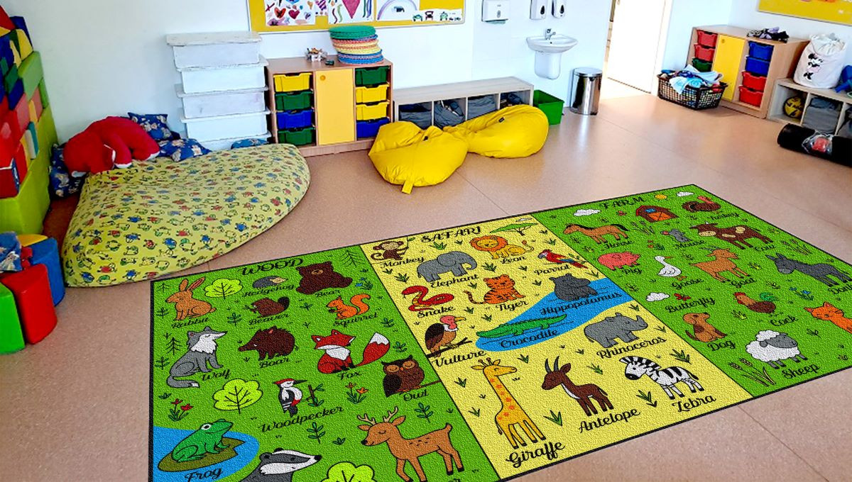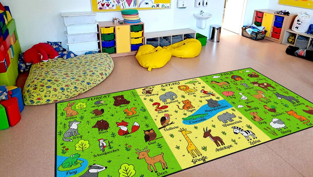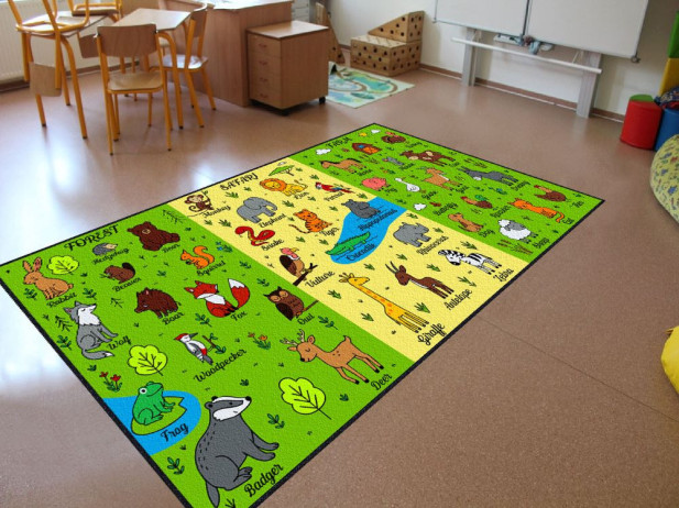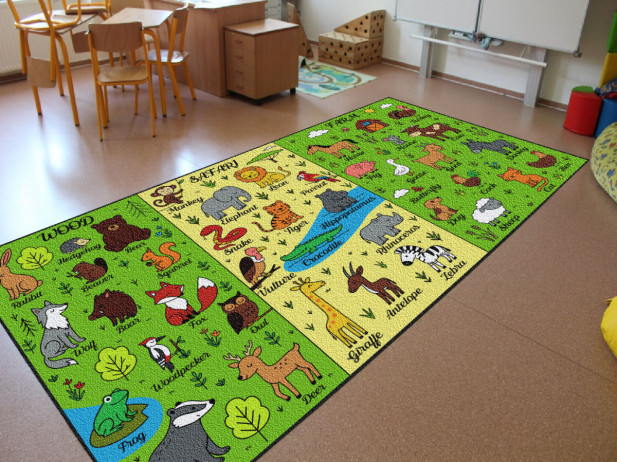 Standardní rozměry: 400 x 200 cm | Didaktický koberec ZVÍŘATA (anglicky) | Velmi odolný materiál na vysokou zátěž - Polyamid Etoncolor | Pratelný | Protiskluzový podklad | Bezpečnostní obvodové lemování proti zakopnutí | Naše zakázková výroba - výroba a dodání 14 dnů
